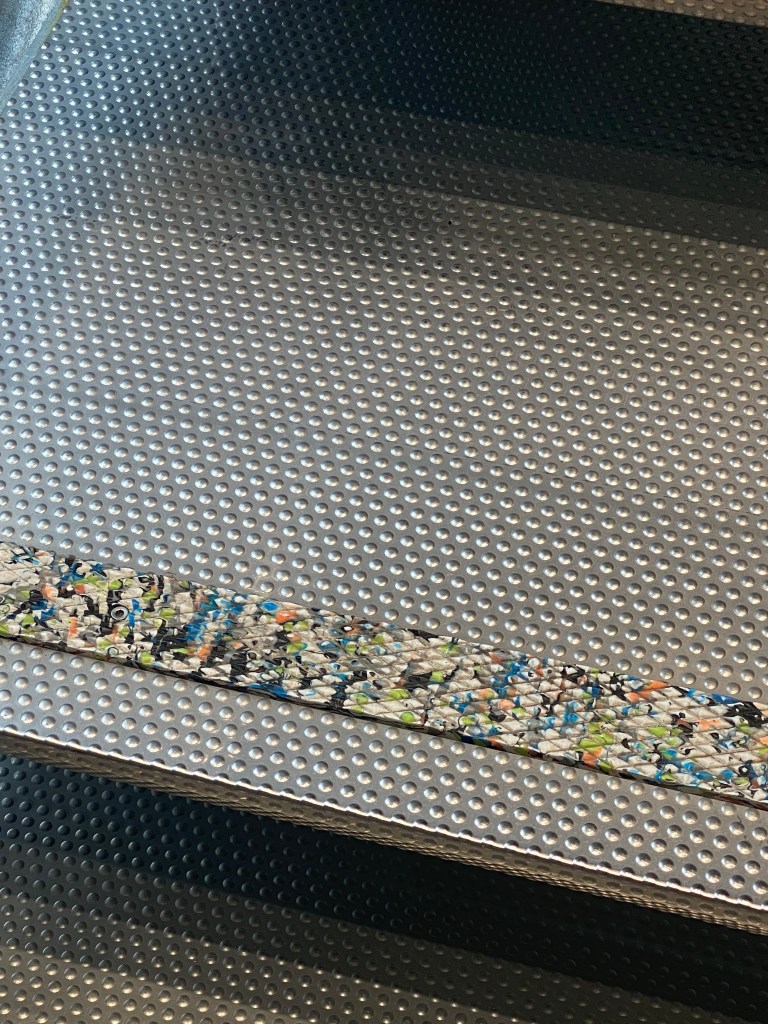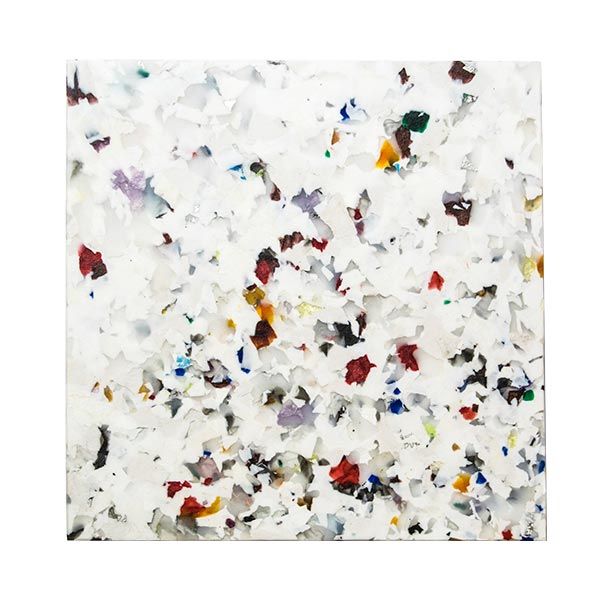스마일 플라스틱은 바다 깊은 곳에 가라앉은 플라스틱 폐기물을 건져 깨끗하게 세척한 후 색상을 섞어 패널로 만들어 집니다. 자세히 보면 플라스틱 조각들이 서로 엉켜 있지만 녹지 않은 압출 상태로 형태를 보존하고 있어 알록달록한 연출이 가능합니다.