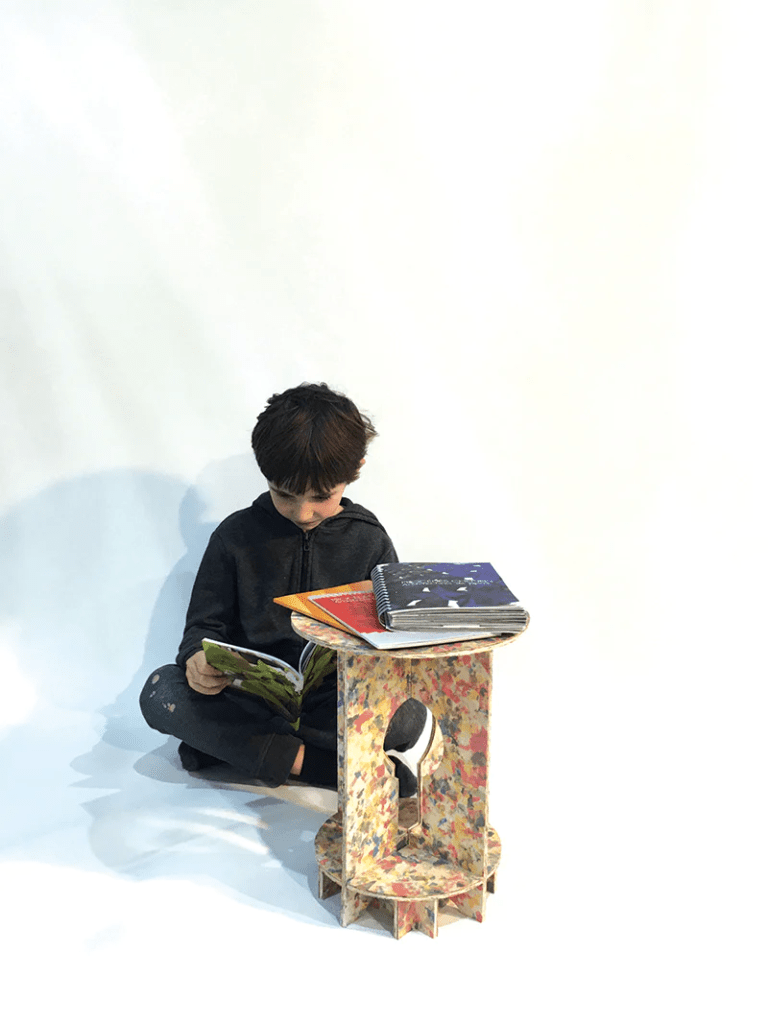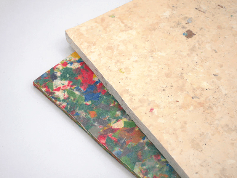 아래 사진에서 처럼 어린이 가구에 적용될 수 있을만큼 제조 과정에서 화학물을 첨가하지 않아 안전하며 단지 열처리로 압착시키는 기술을 사용합니다. 무한 재활용이 가능한 DROP®는 단단한 보드 형태로 8-9mm 두께를 유지 합니다.
