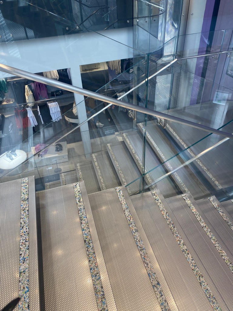 몇일전 명동에 위치한 눈스퀘어의 나이키 라이즈에 다녀왔습니다. 세계에서 두번째 나이키 라이즈 매장이라고 하여 론칭전부터 이미 세간의 주목을 크게 받았던 곳입니다. 이번에 가보니 1층 한켠에 블루보틀이 입점해 있었습니다. 매장 디스플레이도 특별한 것들이 많았는데 도심과 스포츠를 이어주는 맥박이라는 컨셉과 함께 스마일 플라스틱을 활용해 계단에서부터 거치대까지 다양하게 업사이클링 소재를 적용하고 있었습니다. 아래 사진-1과 사진-2는 지난 주 눈스퀘어 방문시 촬영한 사진 입니다.